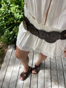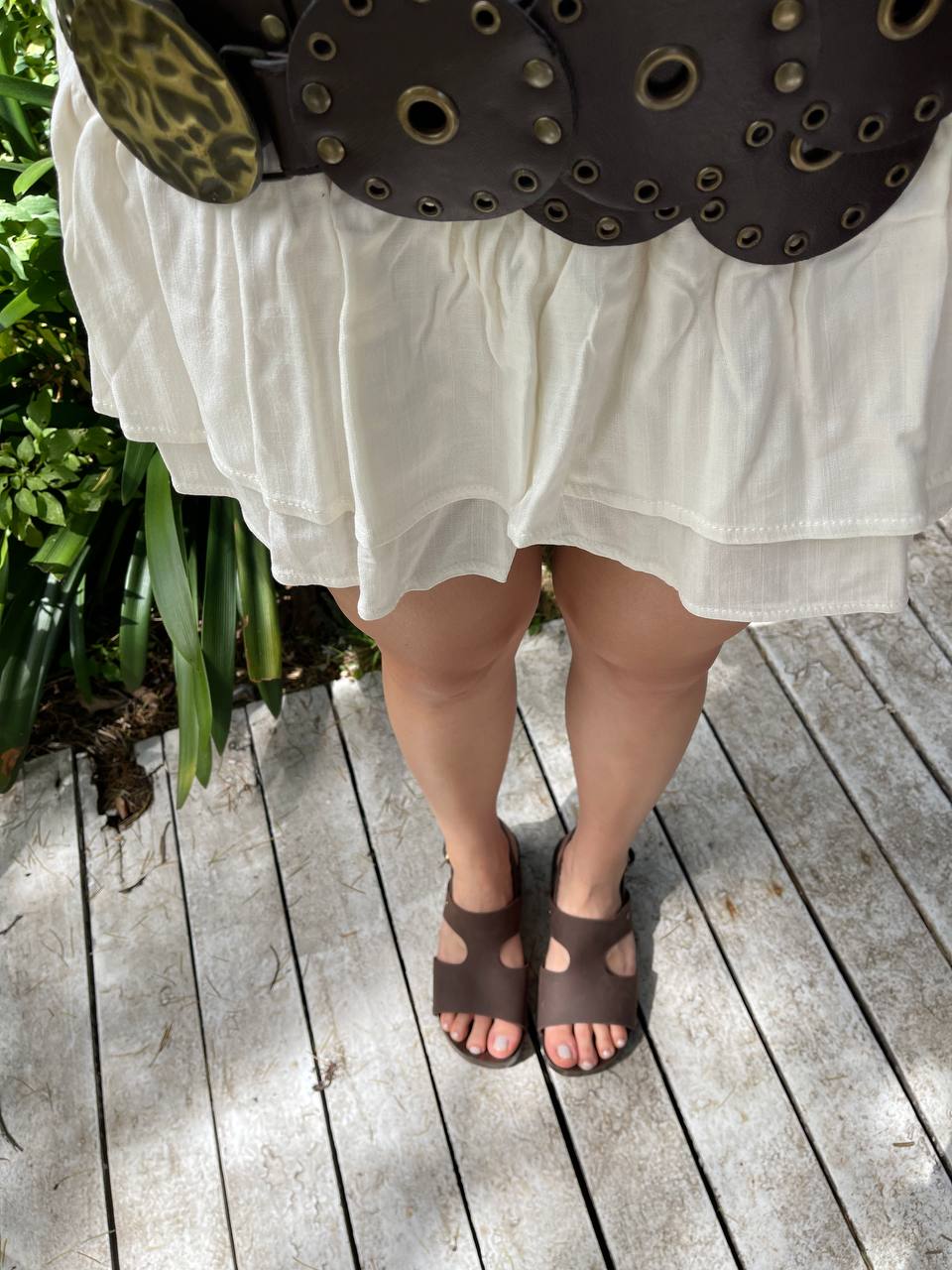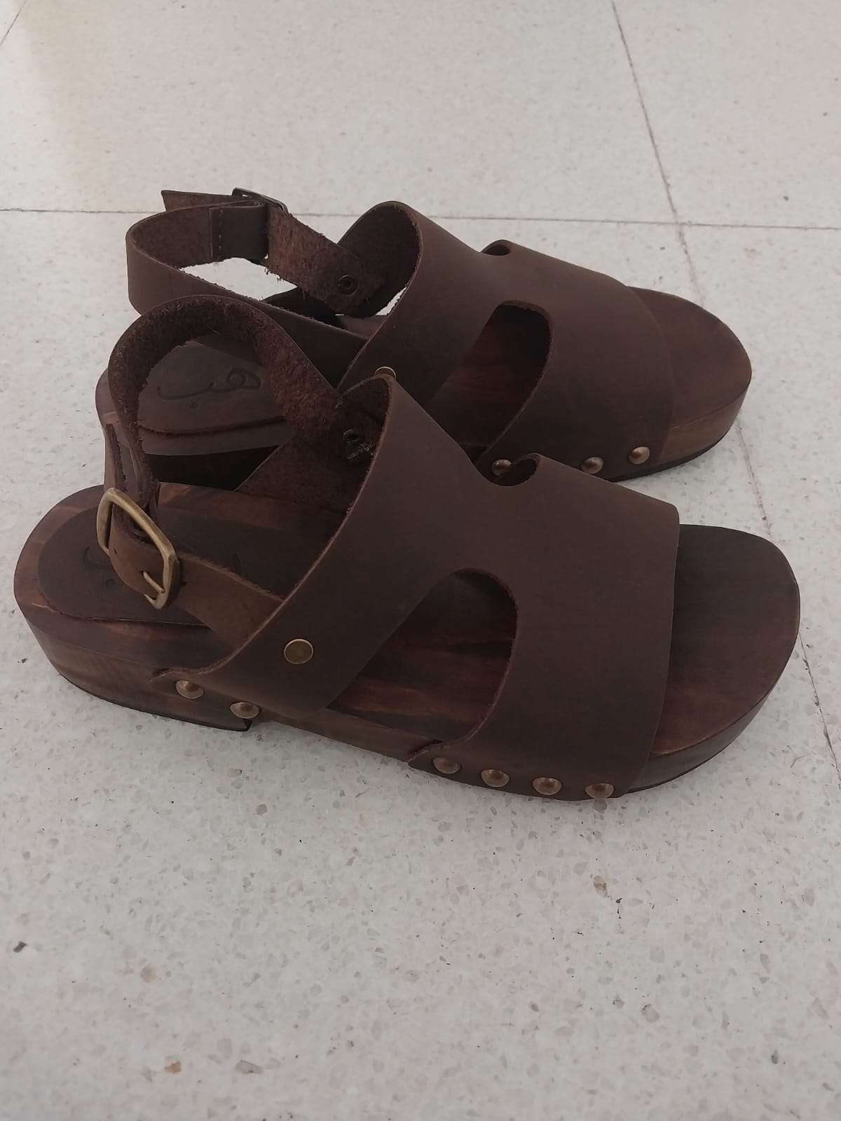Sandalias tipo zueco de base de madera capellada de cuero y tachas.
