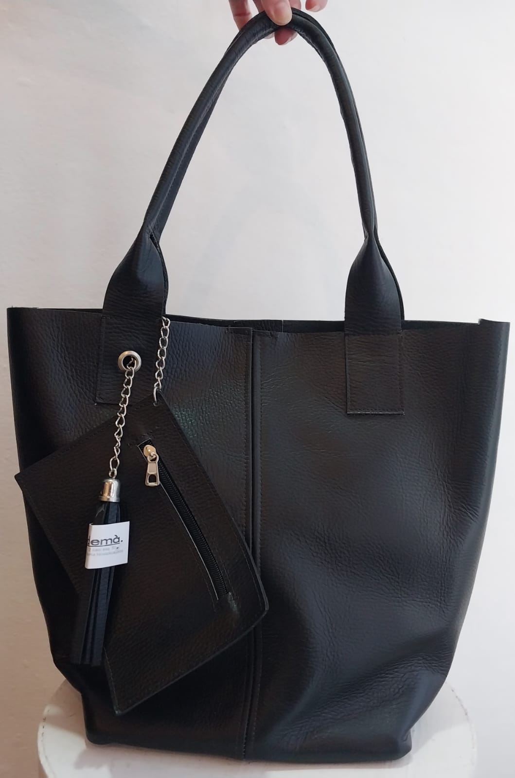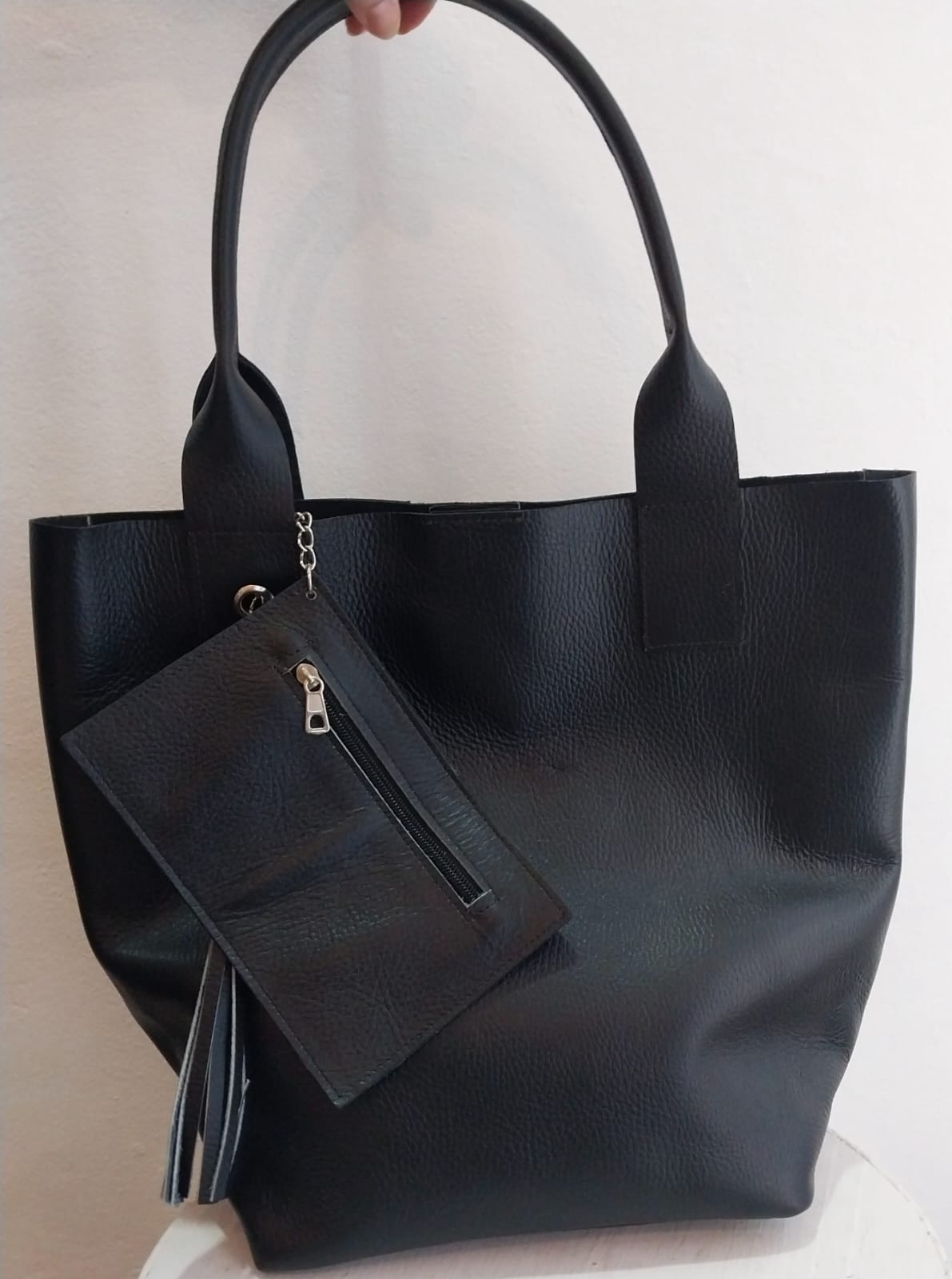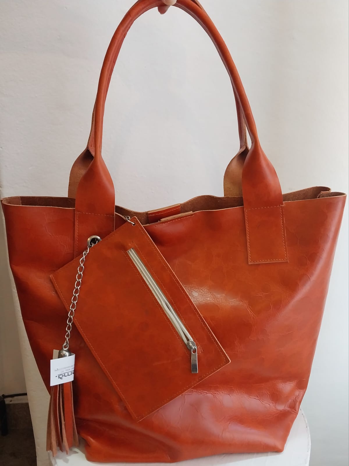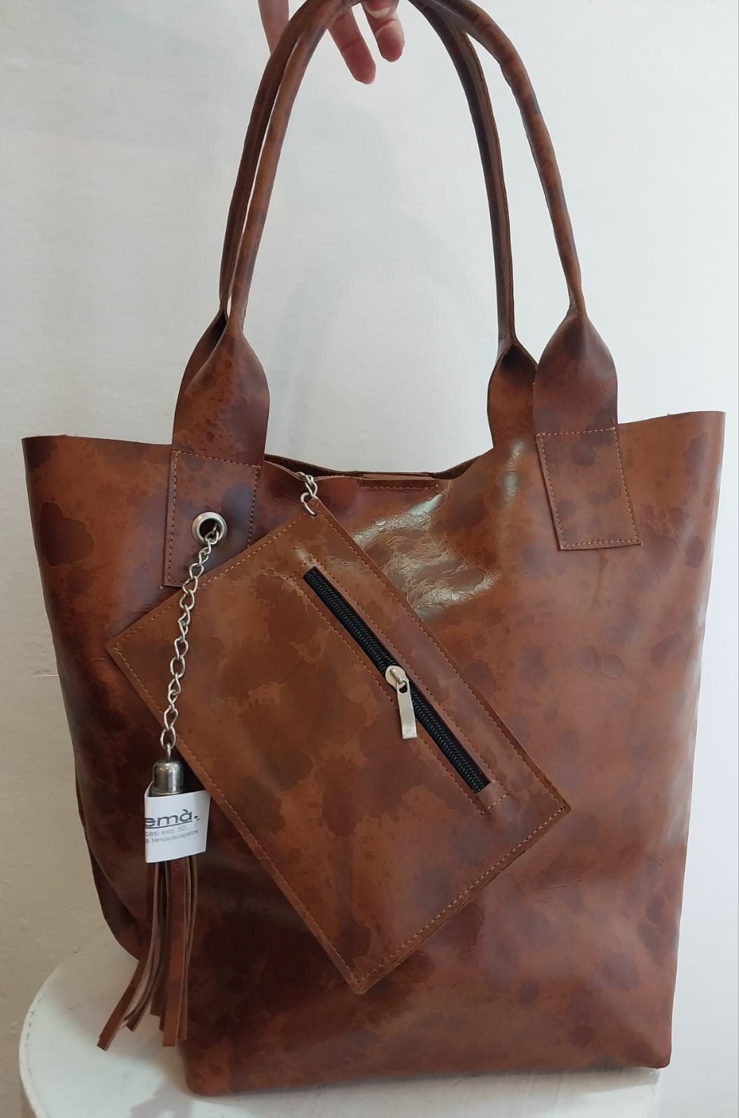 Cartera de cuero , con detalle de flecos y sobre.